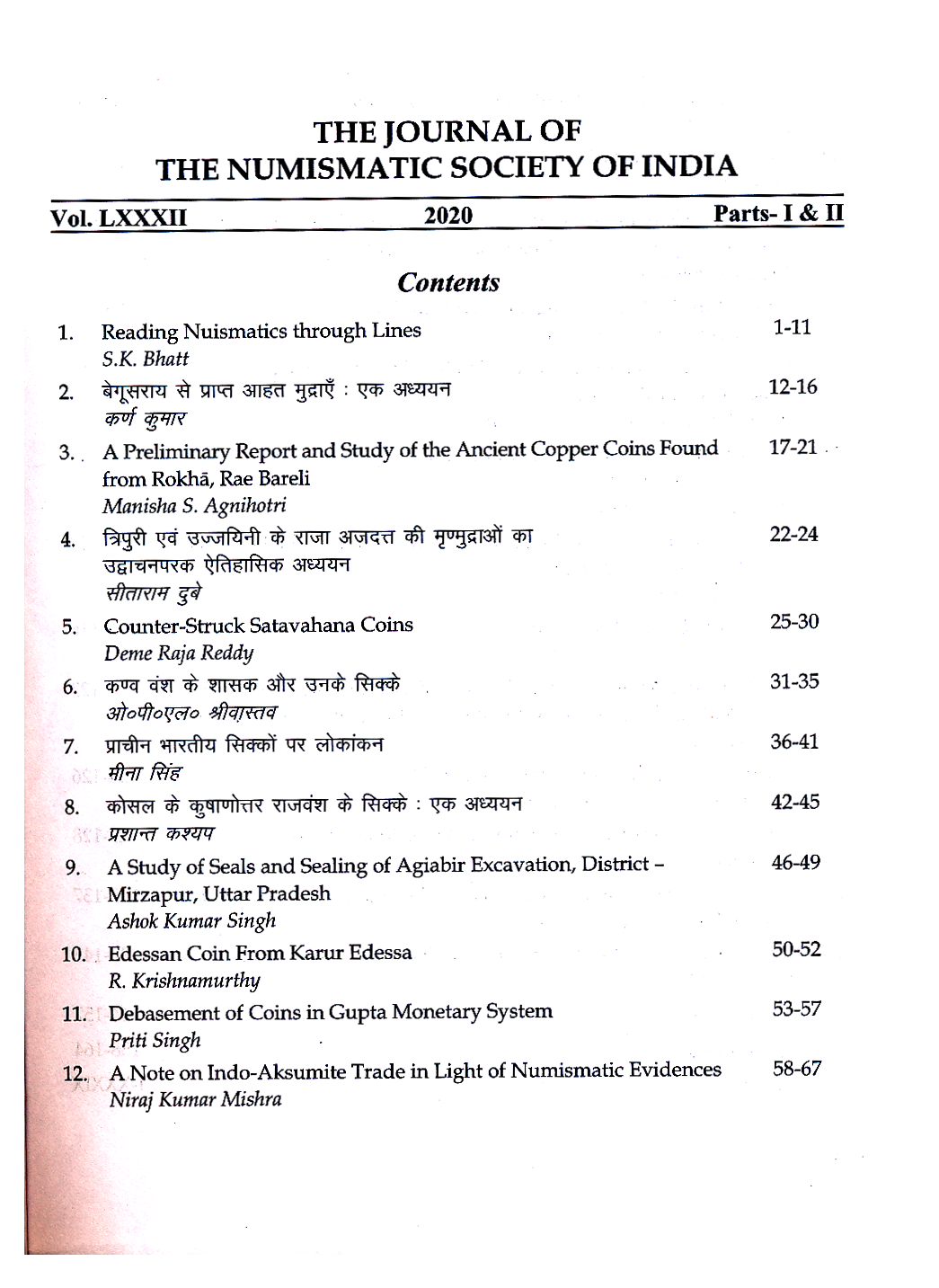 "THE JOURNAL OF THE NUMISMATIC SOCIETY OF INDIA" Vols.LXXI 2009 Parts I & II By Prof. Jai Prakash Singh-Total Pages 179 Plus 4 Plates