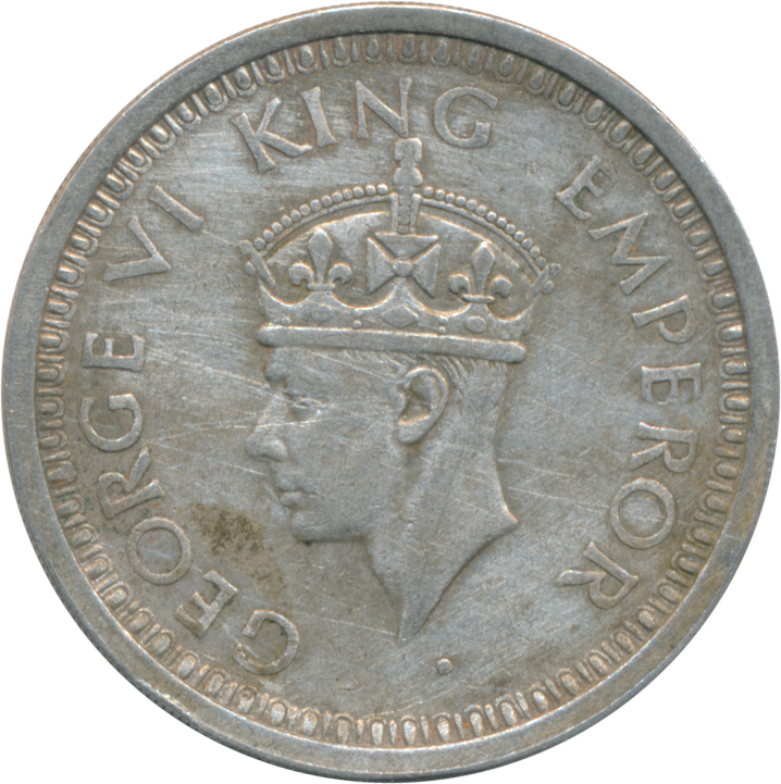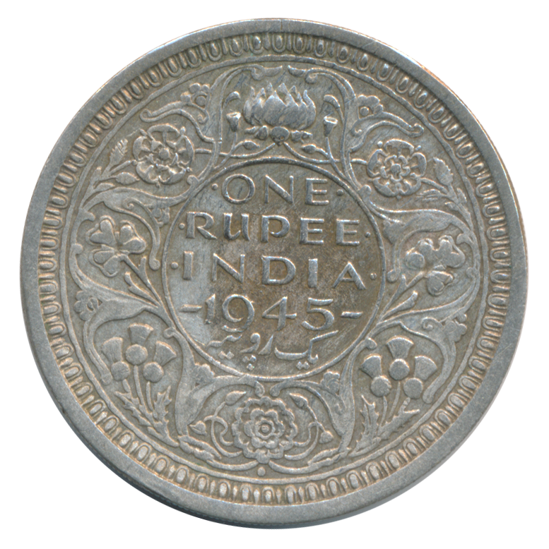 George VI, Half Silver One Rupee, 1945, Obv: Crowned head to left, Rev: Denomination & Date within circle, wreath surrounds, Very Fine.