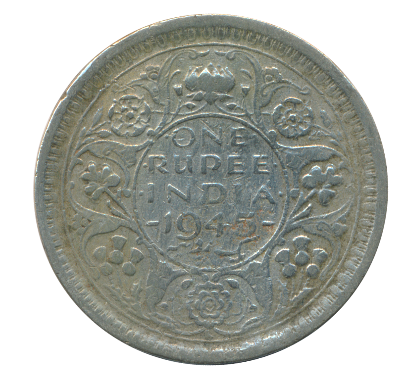 George VI, Half Silver One Rupee, 1945, Obv: Crowned head to left, Rev: Denomination & Date within circle, wreath surrounds, Very Fine.