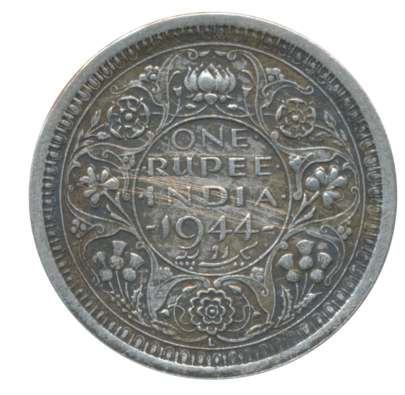 George VI, Half Silver One Rupee, 1944, Obv: Crowned head to left, Rev: Denomination & Date within circle, wreath surrounds, Very Fine.