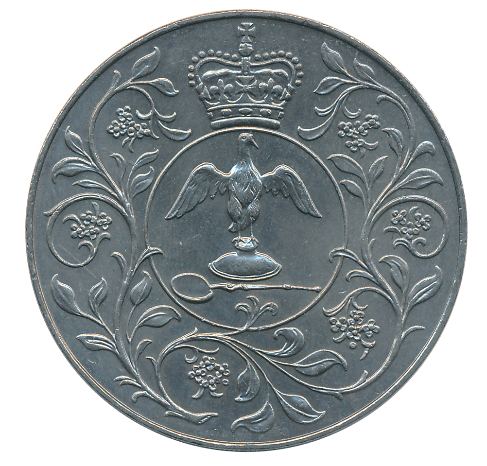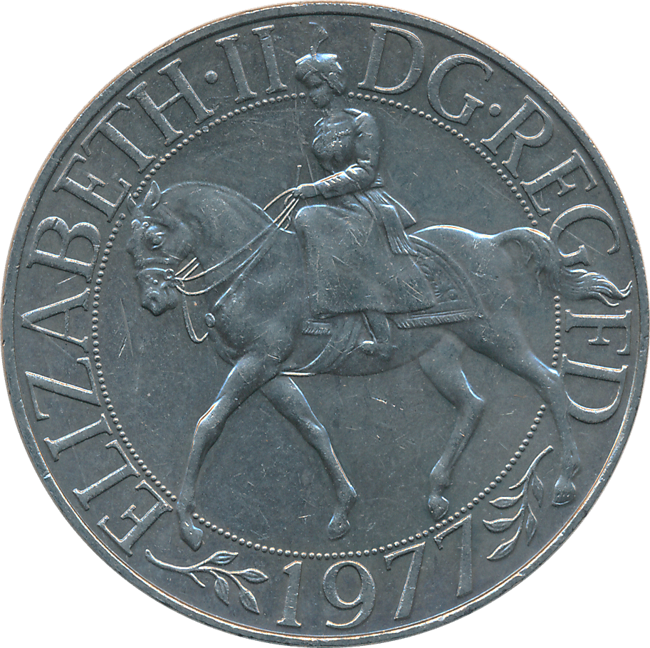 United Kingdom, Copper Nickel, 1977, “25th anniversary of accession of Queen Elizabeth II”, Obv: HM Queen Elizabeth II riding horse to left, legend around, date below, Rev: Crown of Edward, ampulla and golden spoon, flower decoration.