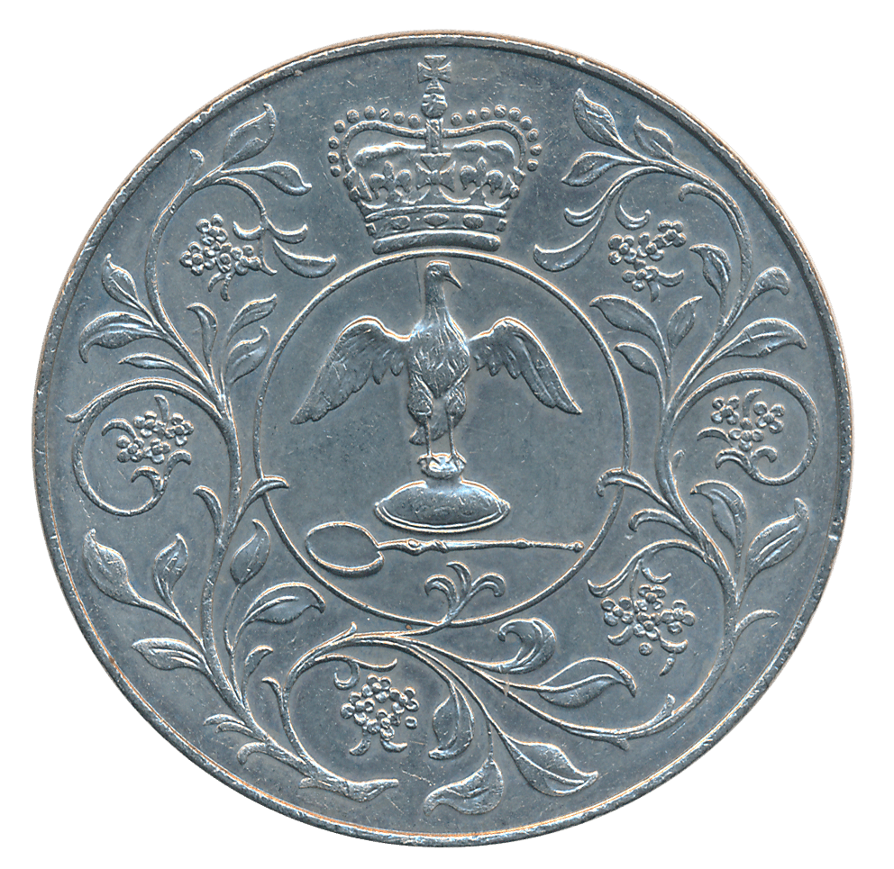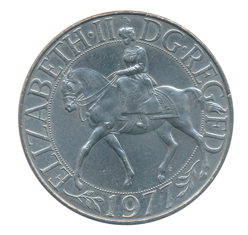 United Kingdom, Copper Nickel, 1977, “25th anniversary of accession of Queen Elizabeth II”, Obv: HM Queen Elizabeth II riding horse to left, legend around, date below, Rev: Crown of Edward, ampulla and golden spoon, flower decoration.