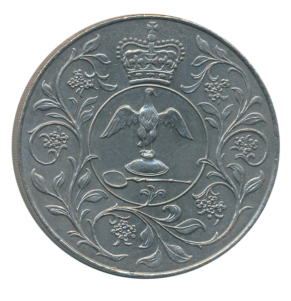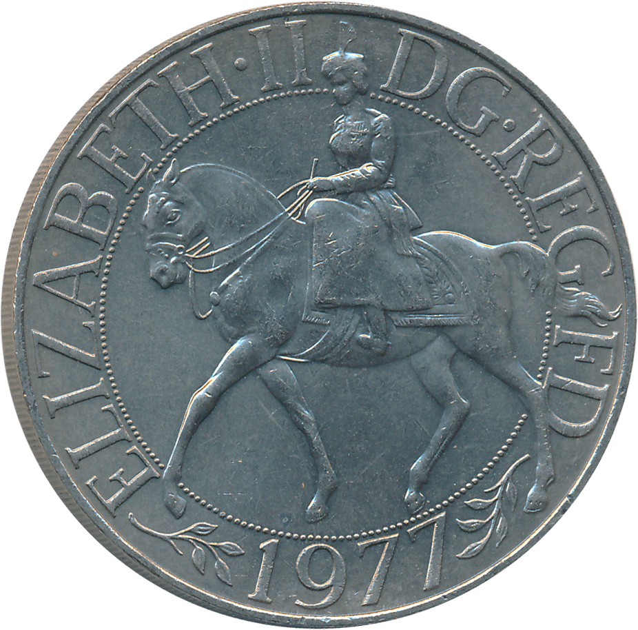 United Kingdom, Copper Nickel, 1977, “25th anniversary of accession of Queen Elizabeth II”, Obv: HM Queen Elizabeth II riding horse to left, legend around, date below, Rev: Crown of Edward, ampulla and golden spoon, flower decoration.