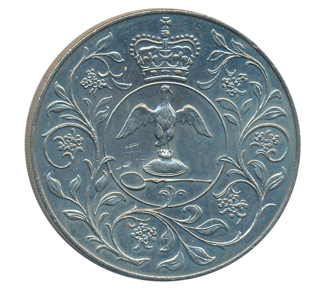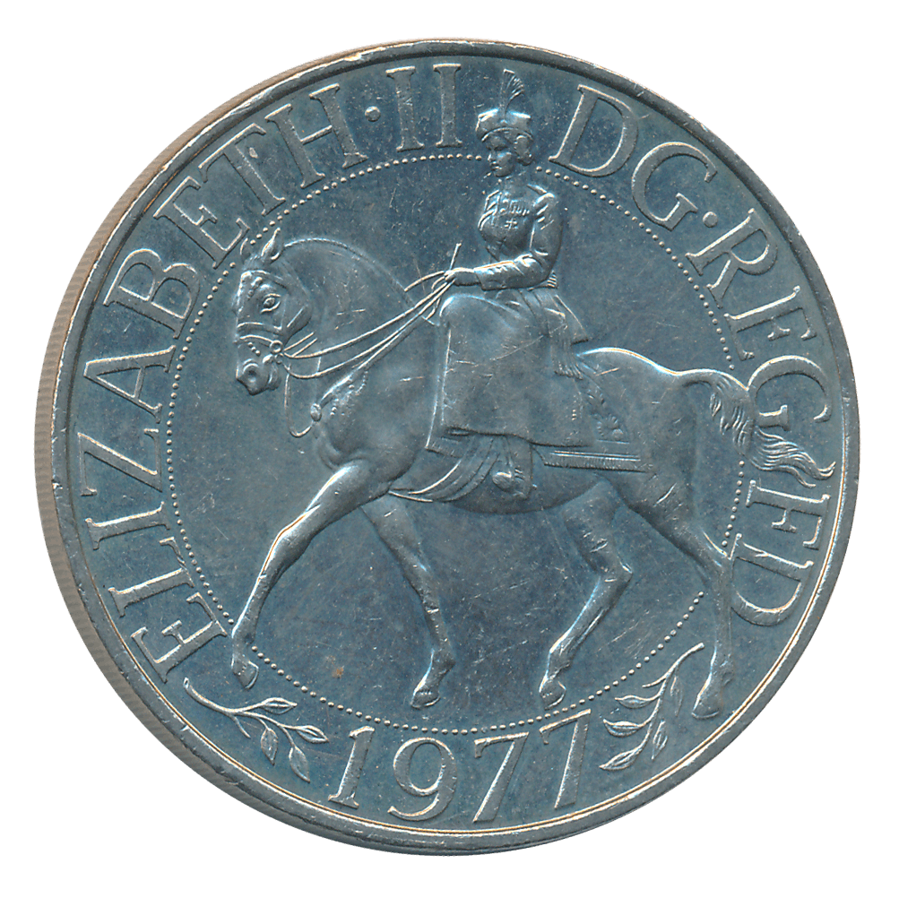 United Kingdom, Copper Nickel, 1977, “25th anniversary of accession of Queen Elizabeth II”, Obv: HM Queen Elizabeth II riding horse to left, legend around, date below, Rev: Crown of Edward, ampulla and golden spoon, flower decoration.