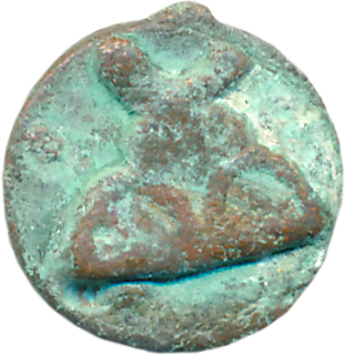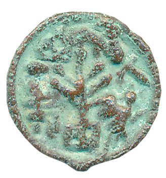 Post Ananda Banavasi, Buddhananda Satkarni, Potin, 1.22g, Bull to right Type, Obv: Bull to right, river like wavy lines below, Brahmi legend “Rano Vishnu Ruda Bu(ddhanandasa)”, Rev: Bow and arrow like devices, lines and circles (Pieper# 2115). About extremely fine.