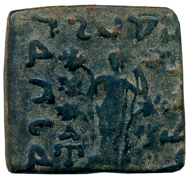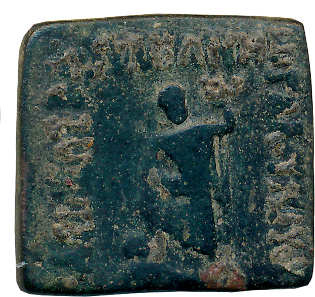 Indo Greeks, Philoxenos, Copper, 8.48g, Obv: Tyche standing holding cornucopia, Greek legend “ΒΑΣΙΛΕΩΣ ΑΝΙΚHΤΟΥ ΦΙΛΟΚΖΗΝΟΥ”, Rev: Bull walking to right, Kharosthi legend “Maharajasa Apatihatasa Philasinasa” (Hoover# 274). Patinated, very fine+, rare.