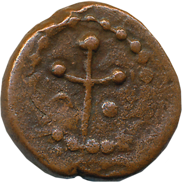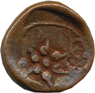 Nayakas of Tanjore, Copper, 2.43g, Obv: Vaishnavita symbol in center, Tortoise on both sides, Rev: Tamil letter “Shri”. Extremely fine, rare.