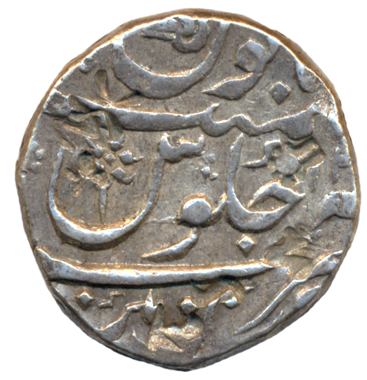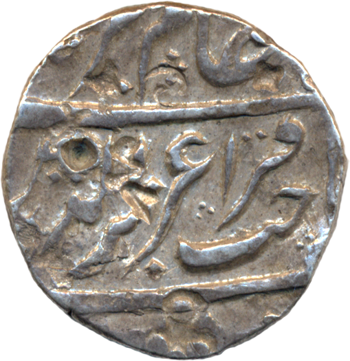 Mulher- Aurangnagar, Silver Rupee, 11.31g, “Sahib-i-qiran” couplet, in the name of Alamgir II, Shivpindi and flower symbol on reverse (M&W# T2b). Very fine.