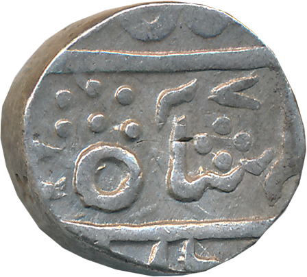Madho Rao, Silver 1/4 Rupee, 2.68g, Bhilsa Mint, in the name of Shah Alam II, Devnagari “Ma” on reverse, Sword as Mint mark (Not listed in KM). Very fine, rare.